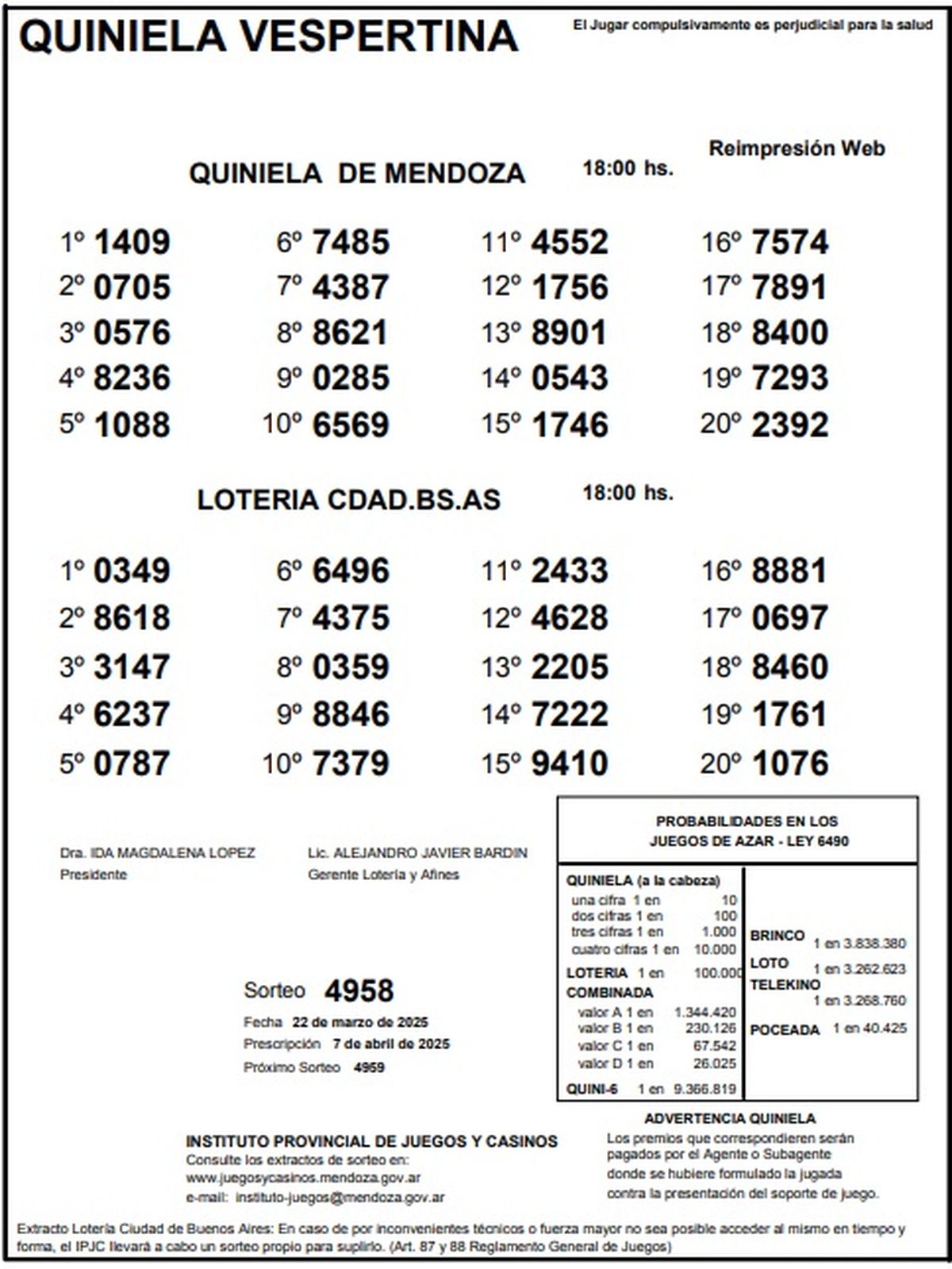 Resultados Quiniela de Mendoza: La Vespertina del 22 de marzo de 2025