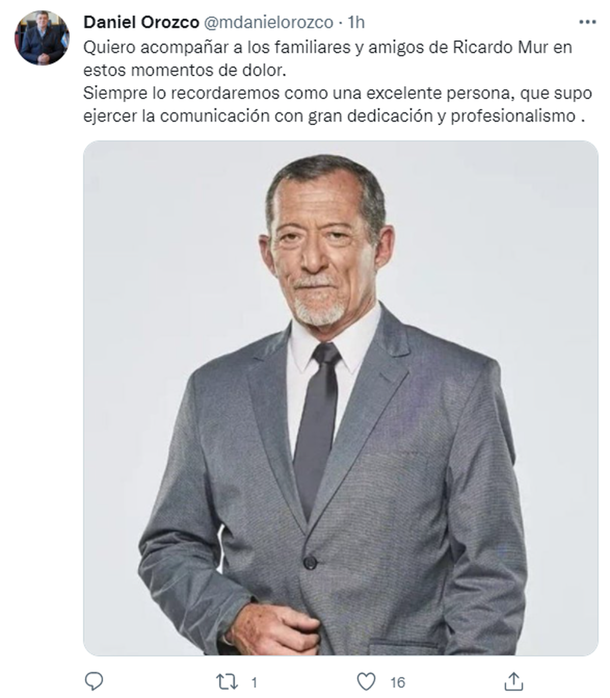"Quiero acompañar a los familiares y amigos de Ricardo Mur en estos momentos de dolor. Siempre lo recordaremos como una excelente persona, que supo ejercer la comunicación con gran dedicación y profesionalismo", twitteó Daniel Orozco, intendente de Las Heras, para despedir a Ricardo.
