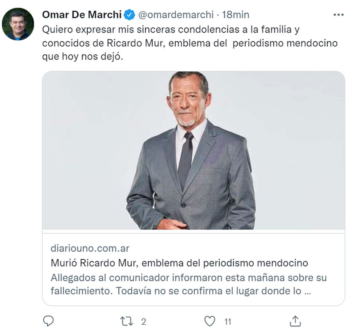 "Quiero expresar mis sinceras condolencias a la familia y conocidos de Ricardo Mur, emblema del periodismo mendocino que hoy nos dejó", dijo Omar De Marchi, diputado nacional del PRO.