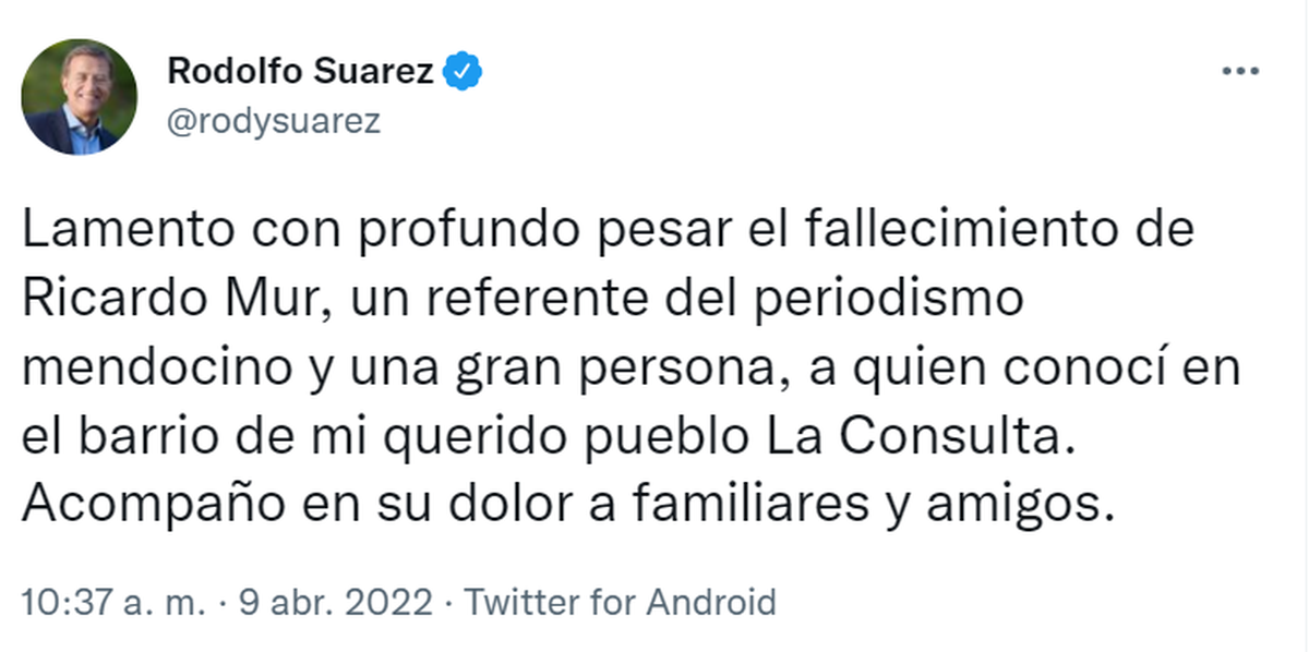 "Lamento con profundo pesar el fallecimiento de Ricardo Mur, un referente del periodismo mendocino y una gran persona, a quien conocí en el barrio de mi querido pueblo La Consulta. Acompaño en su dolor a familiares y amigos", escribió Rodolfo Suarez a través de Twitter.