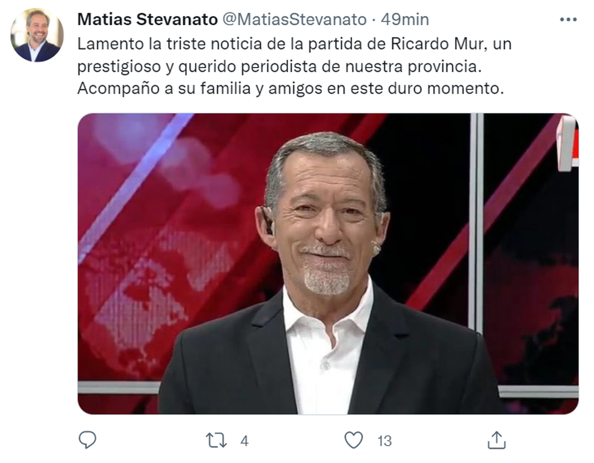 "Lamento la triste noticia de la partida de Ricardo Mur, un prestigioso y querido periodista de nuestra provincia. Acompaño a su familia y amigos en este duro momento", escribió Matías Stevanato, intendente de Maipú, en su cuenta de Twitter.