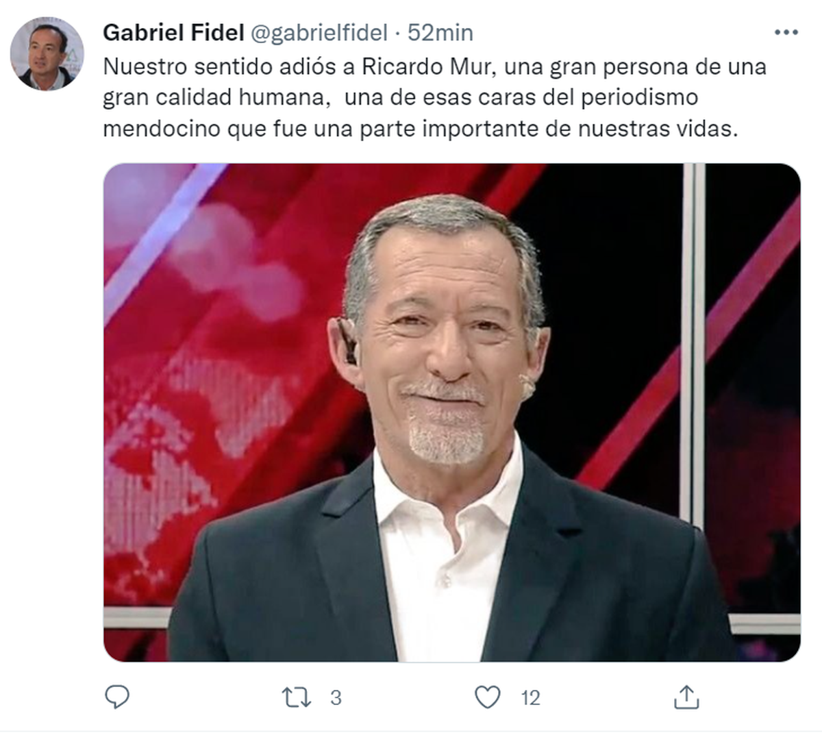 Nuestro sentido adiós a Ricardo Mur, una gran persona de una gran calidad humana, una de esas caras del periodismo mendocino que fue una parte importante de nuestras vidas", dijo Gabriel Fidel, presidente de la Agencia Mendocina de Innovación, Ciencia y Tecnología de Mendoza.