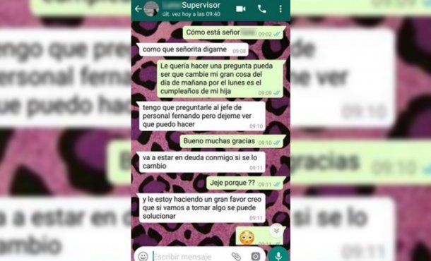 En los chat se puede leer que la mujer le pide al supervisor un cambio de turno para poder estar en el cumpleaños de su hija. Ante esto, el hombre le dice que sí, pero a cambio de "horas extras" con él.
