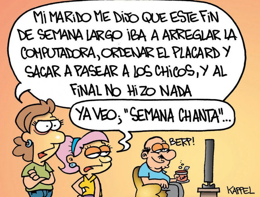 Inicio El humor de Kappel El humor de Kappel. 28 de marzo de 2016 - 08:00 Bendita "semana chanta" Por UNO Temas relacionados: El humor de Kappel Humor las más leídas Horror Asesinato en el cotillón: una mujer le debía plata al dueño del local y este no se la perdonó Por Miguel Guayama Tendencia El nivel de reservas turísticas para el próximo finde XL en Mendoza no supera el 50% Por Miguel Ángel Flores Mundo China avanza con la construcción de 12.000 viviendas en este país de América Latina y sella su influencia en la región Por Valentina Araya Educación La DGE convocó a 135 docentes que quedaron sin horas por cierres de escuelas y cambios curriculares Por Pablo Abihaggle