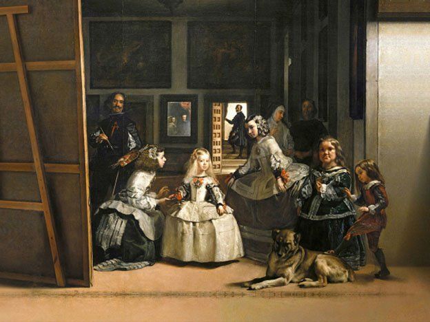 En Las Meninas, el pintor nos introduce en su taller. Velázquez trabaja en el cuadro cuando espontáneamente entran en la sala, en la que (según una de las múltiples interpretaciones) están ya los monarcas reflejados en el espejo del fondo, la infanta Margarita con sus damas y un pequeño séquito.