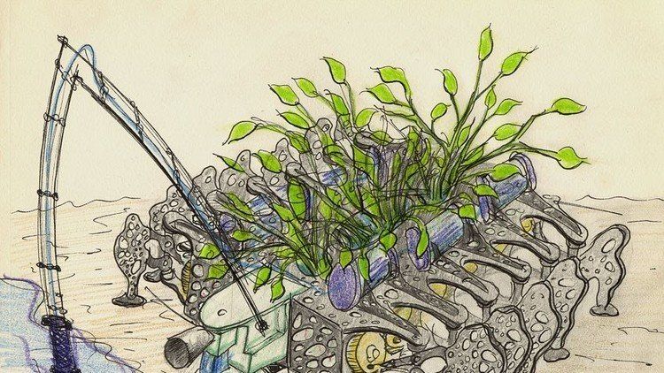 El artista explica que la planta nómada se integra al ecosistema y tiene la posibilidad de sobrevivir. Eso hace una simbiosis con su entorno. En el agua hay bacterias, las recoge y las lleva a pilas biológicas, contenedores internos, donde se desarrollan y empiezan a alimentarse. Luego invita a las bacterias que están en el agua. Las bacterias, en sus procesos metabólicos, generan electricidad.