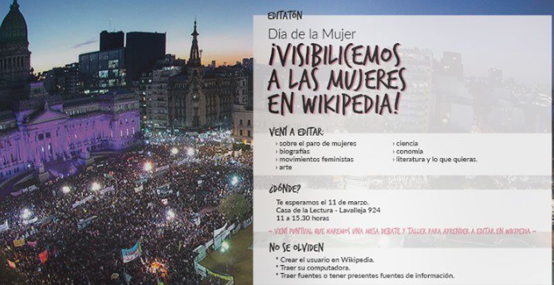 Wikimedia Argentina y la Red Internacional de Periodistas con Visión de Género (Ripvg) invitaron a toda la comunidad a participar el próximo 11 de marzo de la "Editatón por el Día de la Mujer Trabajadora", un encuentro para aprender a editar en Wikipedia e incluir en esa biblioteca virtual artículos sobre biografías de mujeres, el #NiUnaMenos y movimientos artísticos, entre otros temas. El encuentro es gratuito y tendrá lugar el próximo sábado 11 de marzo a partir de las 11, en la Casa de la Lectura, ubicada en Lavalleja 924 del barrio porteño de Villa Crespo, informaron hoy las organizaciones en un comunicado.