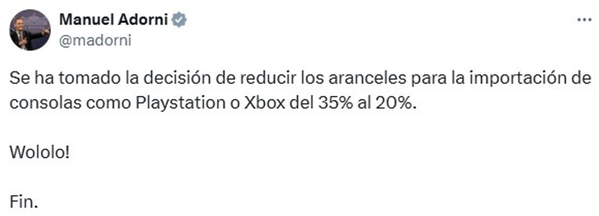 Manuel Adorni agregó con sus redes que "se ha tomado la decisión de reducir los aranceles para la importación de consolas como Playstation o Xbox del 35% al 20%. Wololo!"