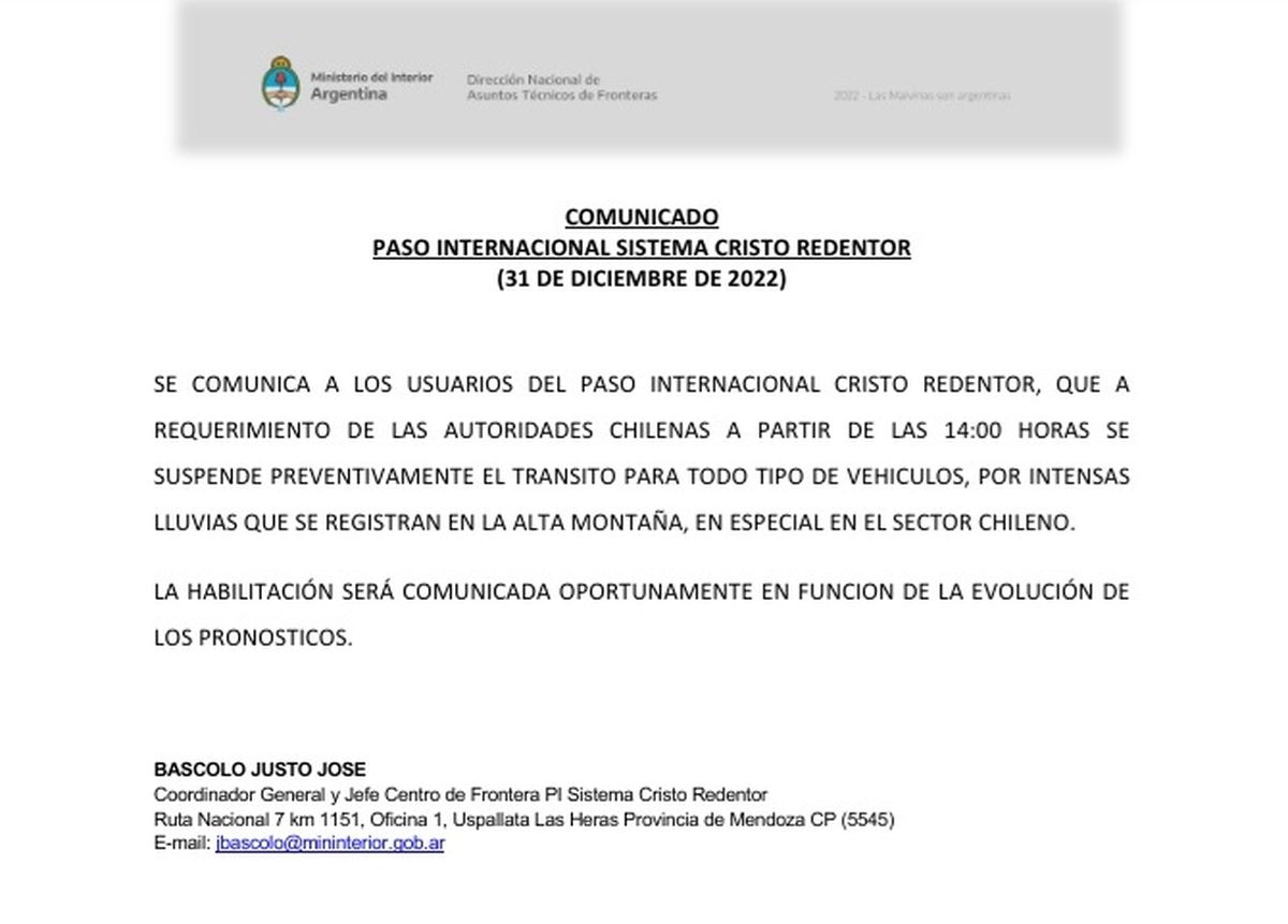 El coordinador del Sistema Cristo Redentor, Justo José Báscolo, informó que ese paso a Chile se cerró desde este sábado a partir de las 14.