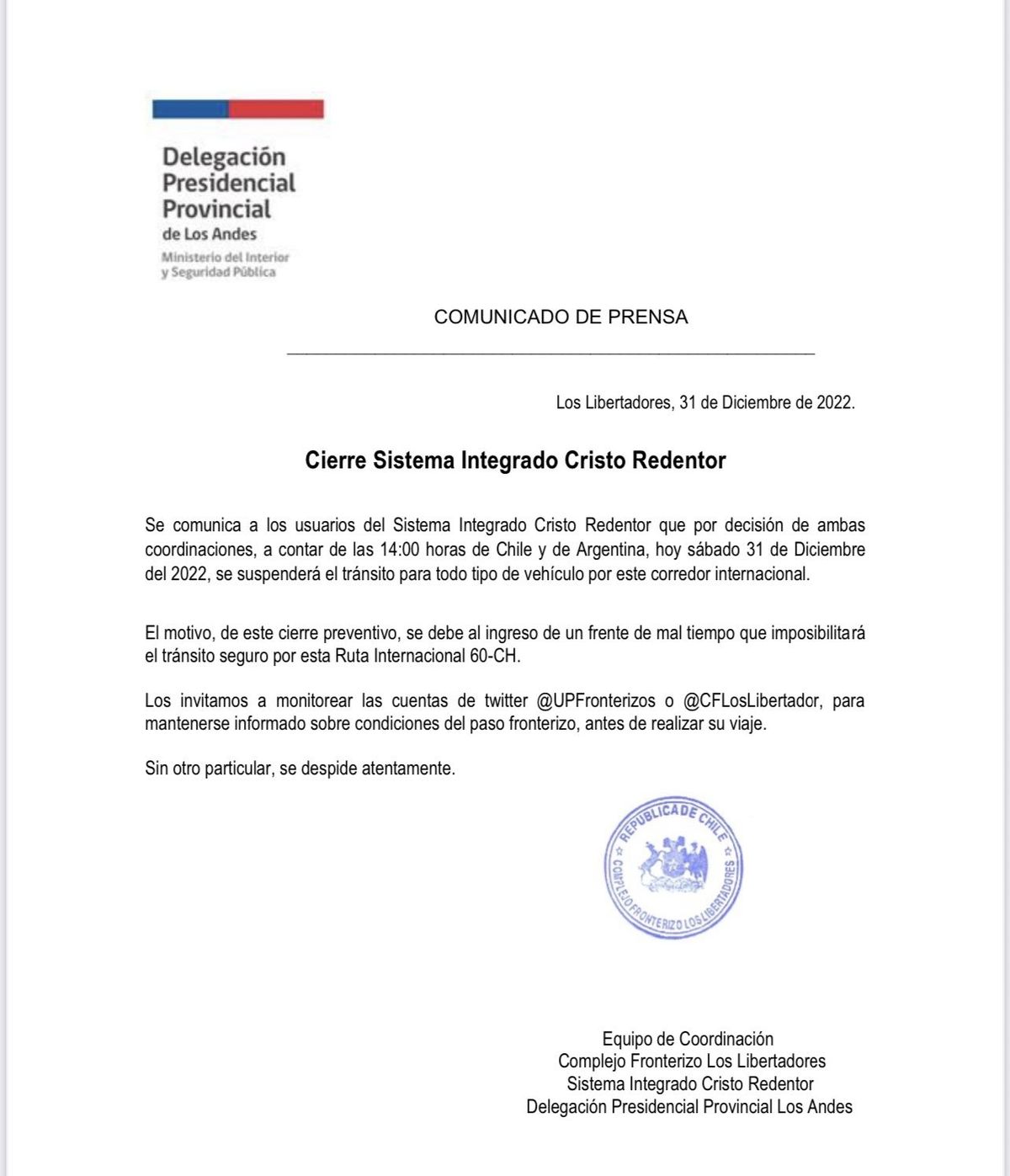 Las autoridades trasandinas recalcaron que el cierre lo decidieron "ambas coordinaciones" debido a un "frente de mal tiempo"; e instaron a seguir las cuentas oficiales en procura de las próximas novedades.