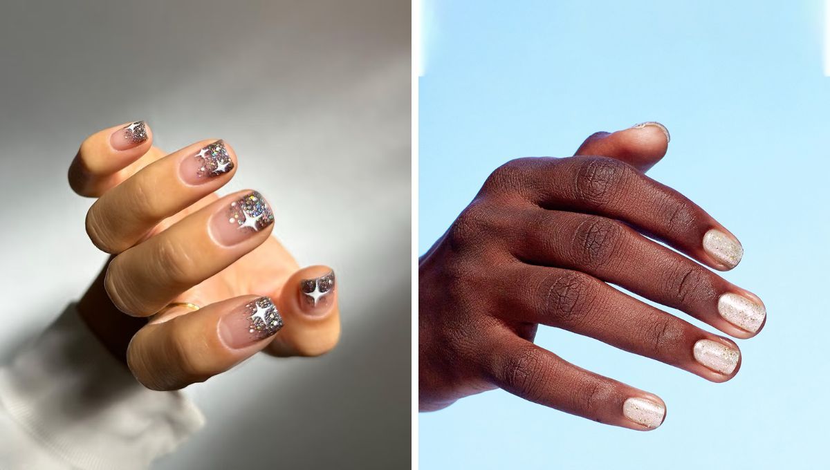Si solo quieres darles a tus uñas un pequeño toque de glitter, una gran opción es aplicar el esmalte elegido en una esponja y luego dar toquecitos en la punta de la uña.