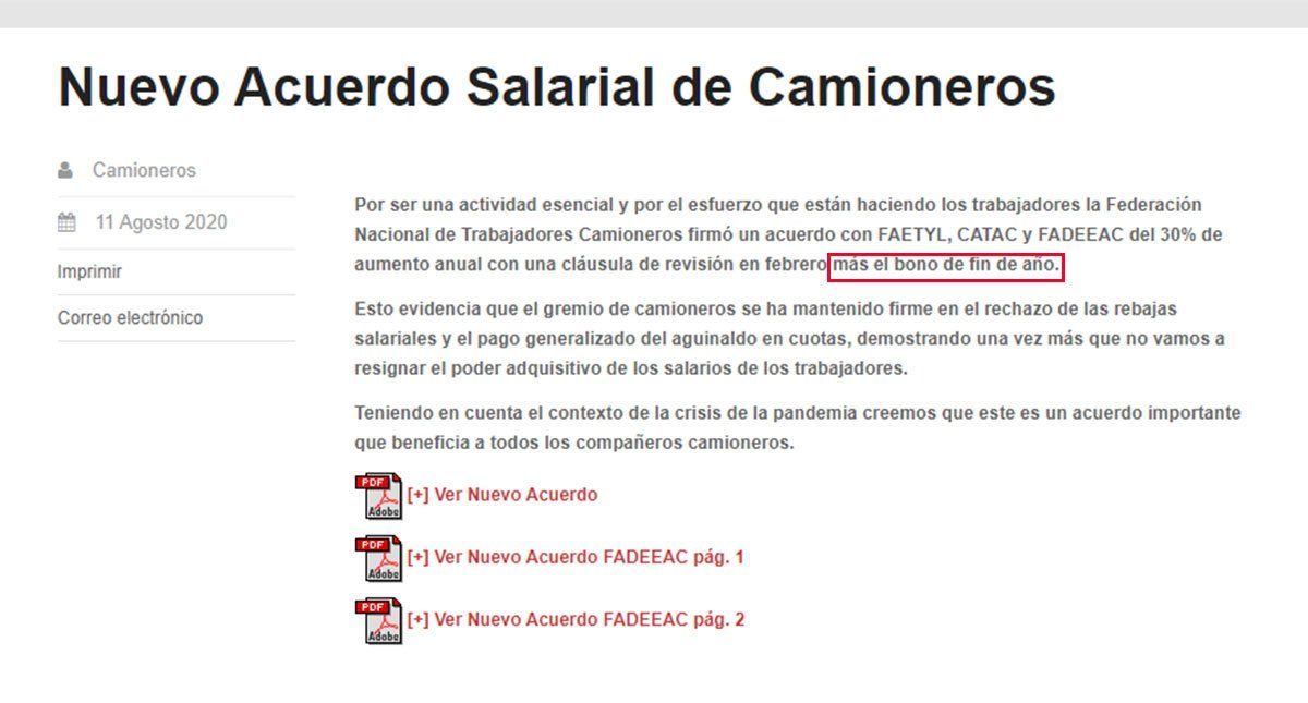 Tras la firma, el sindicato dio a conocer a través de un comunicado el nuevo arreglo y allí expresaron que se incluía un bono de fin de año. Sin embargo, esto no aparecía detallado en el escrito y tampoco se manifestó su monto.