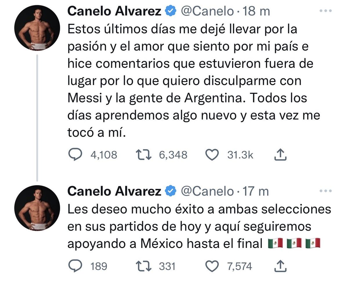 "Estos últimos días me dejé llevar por la pasión y el amor que siento por mi país e hice comentarios que estuvieron fuera de lugar por lo que quiero disculparme con Messi y la gente de Argentina. Todos los días aprendemos algo nuevo y esta vez me tocó a mí", dijo Saúl Álvarez, de 32 años.