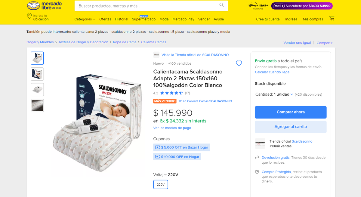 La publicación de Mercado Libre dice que el precio $145.990 y da la posibilidad de pagarla en 6 cuotas sin interés. Esta marca de calientacama para dormir sin frío es una de las más económicas en esta medida, una más costosa puede salir $152.990 (tamaño King).