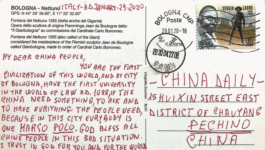 No pude evitar agarrarla, ni podía recordar cuánto tiempo hacía desde que había leído un correo escrito a mano, especialmente uno del otro lado del mundo. La postal, que incluía al dorso una foto de la Fuente de Neptuno, un lugar emblemático de Bolonia, Italia, se había enviado por correo desde esa ciudad a la sede de China Daily en Beijing el 29 de enero. En ella, su autor boloñés expresaba sus sinceros deseos al pueblo chino y al mundo en sus esfuerzos por combatir el nuevo coronavirus.