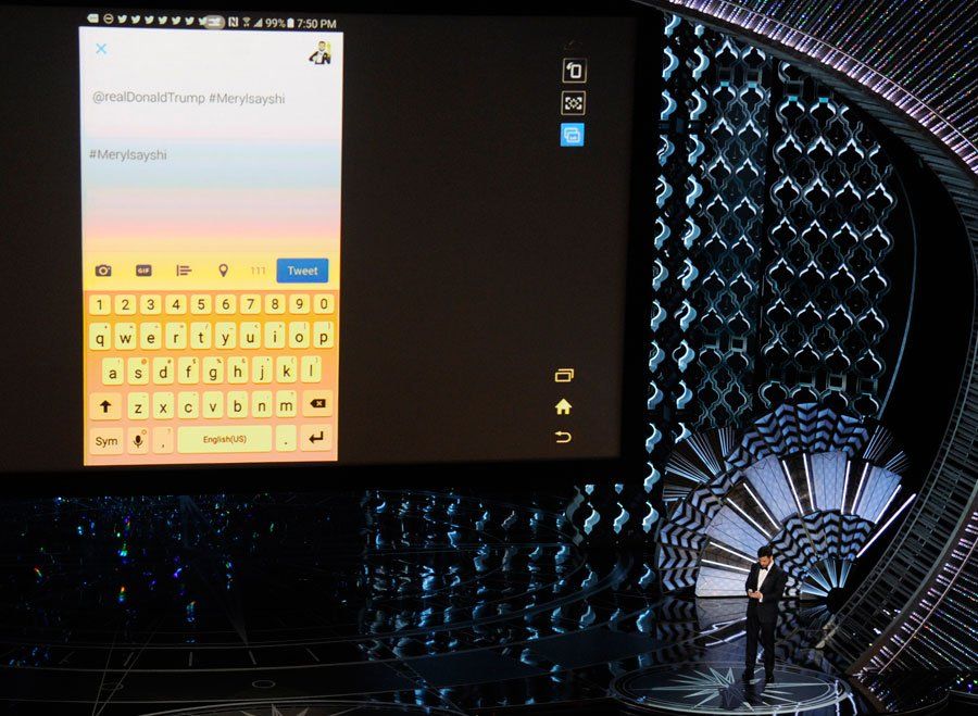 Kimmel bromeó sobre Trump en varias ocasiones y presentó un elaborado argumento para llamar la atención de Meryl Streep, que fue blanco de las críticas del dirigente. Pero en su mayoría, quienes se llevaron a casa un Premio de la Academia dieron las gracias a sus madres y directores y parecieron, o simularon estar, sobrecogidos de emoción. Streep, cuyas críticas al entonces presidente electo en los Globos de Oro eclipsaron esa gala, se ajustó al guion cuando se subió al escenario para entregar un premio.