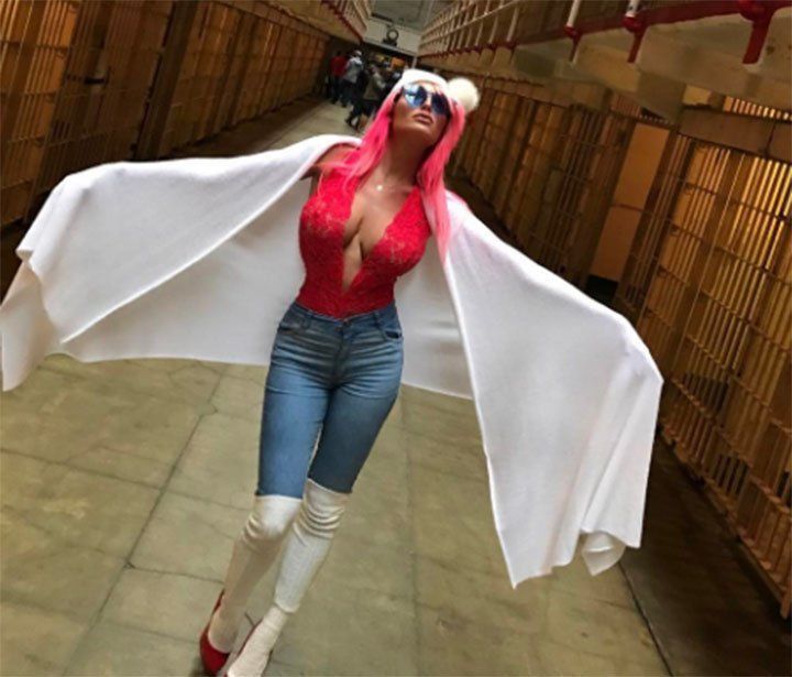 La mediática recorrió la penitenciaría, que fue convertida en museo y es una de las mayores atracciones turísticas de San Francisco, envuelta en una manta blanca, unos ajustados jeans y un body rosa furioso que con un escote tan revelador que hubiera debilitado a cualquier criminal... claro que le llovieron las críticas, una vez más, por semejante look.