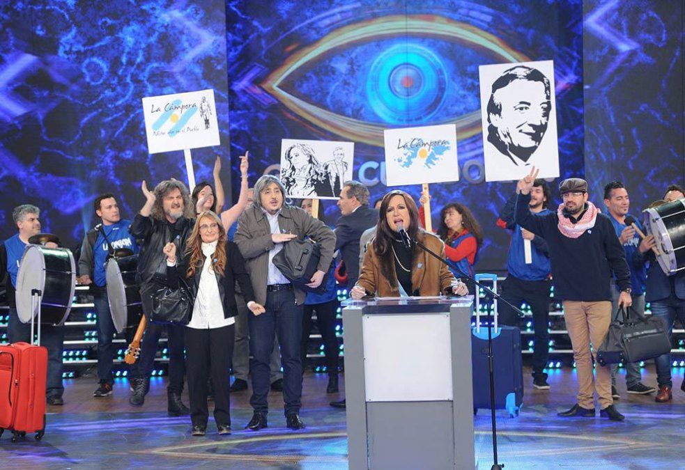 "Cristina Fernández de Kirchner" salió de la casa de Gran Cuñado y pasó por el estudio de ShowMatch, acompañada por Guillermo Moreno, Máximo y Alicia Kirchner, Luis D'Elía, Amado Boudou, militantes y bombos.
