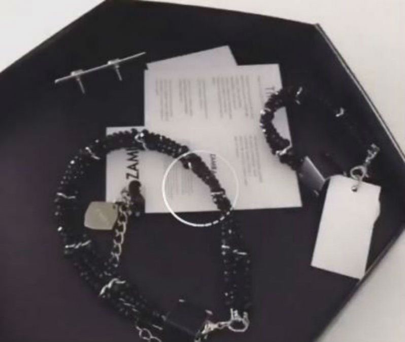 Dentro del packaging aparece un precioso colgante y pulsera de piedras en tono negro, con un diseño de cadenas. Es posible que sea un regalo de la marca rosarina o un adelanto de las joyas que lucirá la novia.