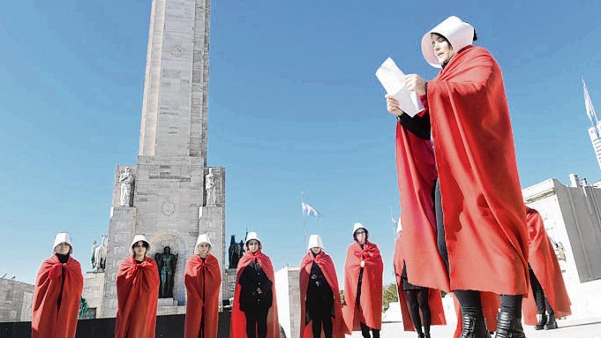 La intervención, que la semana pasada fue protagonizada por actrices porteñas frente al Congreso de la Nación, no toma casualmente la novela escrita originalmente en 1985. No sólo porque en la reedición del año pasado, la propia escritora canadiense explicó que entre los hechos reales sobre los cuales se basó la novela, había tomado la apropiación de bebés que sistemáticamente se llevó adelante en la Argentina durante la última dictadura cívico militar, sino además por la carta titulada "¿Un Estado esclavista?", que Atwood le escribió en julio pasado a la vicepresidenta de la Nación y presidenta del Senado, Gabriela Michetti, y a tras sus dichos en contra de la legalización del aborto. El mismo texto que ayer las militantes feministas rosarinas leyeron a viva voz en el Monumento a la Bandera.