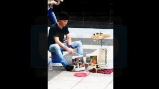 Con cuatro baldes de plástico, platillos y dos palillos de batería, este joven se las ingenió para marcarle el paso de los viandantes.
