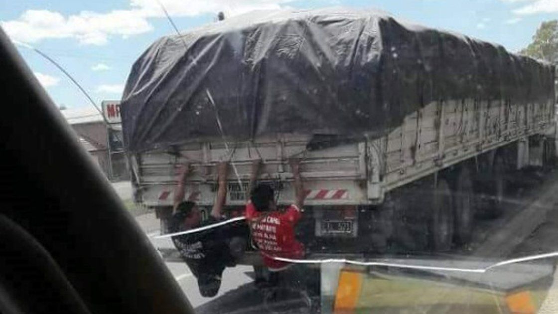 Se viralizó una imagen del periodista Rolando Alvarez, de la agencia Noticias Argentinas, donde se puede ver a dos jóvenes colgados en la parte de atrás de un camión con acoplado en la ruta.