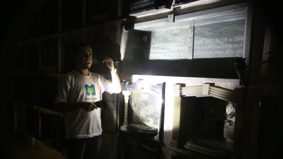 Luego el paseo, y con una ya insistente llovizna (más estereotipos no podían haber) el paseo mostró otras dos velitas allá a lo lejos, en un angosto pasillo entre la capilla de Nuestra Señora del Rosario y el Panteón Militar. Allí fueron los casi 15 visitantes a pararse en un monumental mausoleo. Nada menos que el del ex gobernador Tiburcio Benegas, un fiel representante de la Generación del '80 en Mendoza, llegado como un banquero, para luego transformarse en un vitivinicultor que modernizó la industria del vino y el cultivo de la vid. Fue gobernador de Mendoza tres veces, y senador nacional y embajador en Chile en dos oportunidades.