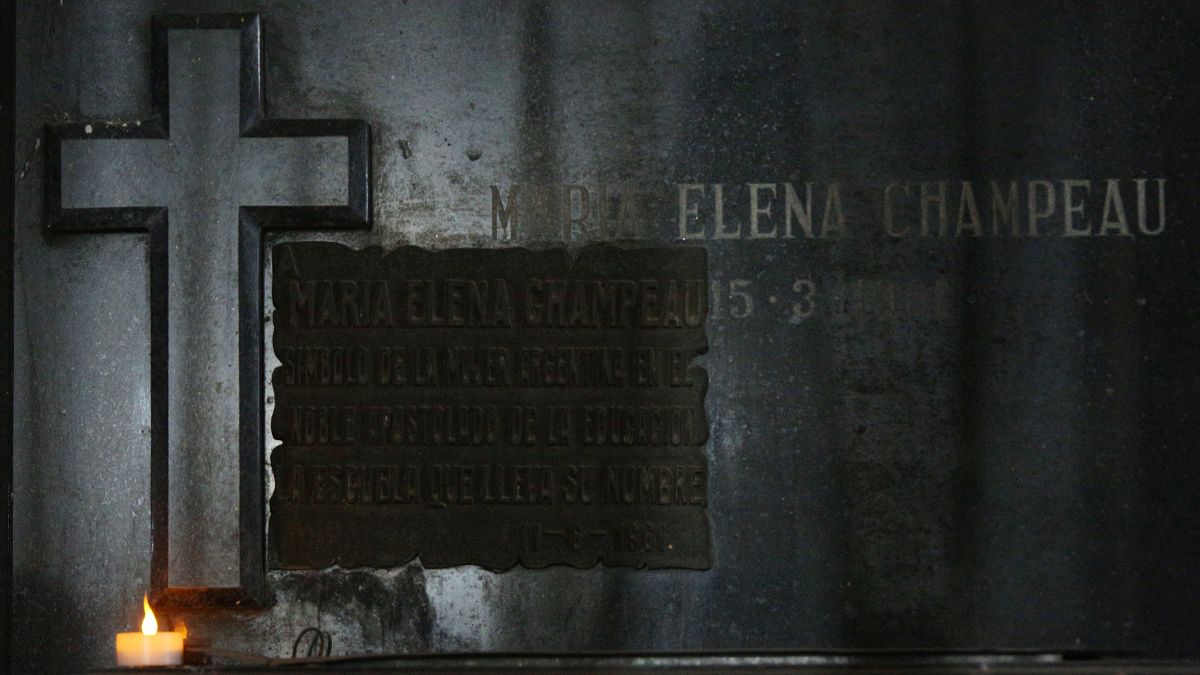 El pasillo lúgubre y a media luz, sólo mostraba una pequeña velita artificial (LED) con una luz mortecina que indicaba cuál era el nicho de la "hacedora" y pionera feminista. Allí detuvo el cortejo de visitantes el guía, y cuando comenzó a relatar la historia de Champeau, ya casi todo el grupo dejó de la lado el morbo de estar rodeado de muertos, mirando de reojos los juegos de luces y sombras que hacían las cortinas y las linternas, para sumergirse en el apasionado relato de Jesús Morales sobre la vida de la mujer ejemplar.