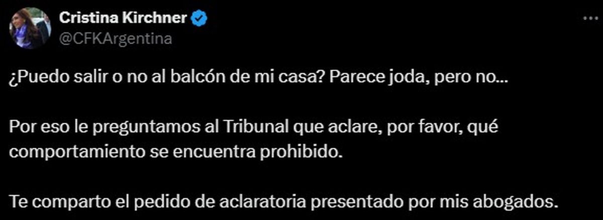 La propia Cristina Kirchner difundió el documento desde su cuenta de X con una ironía: “¿Puedo salir o no al balcón de mi casa? Parece joda, pero no…”.