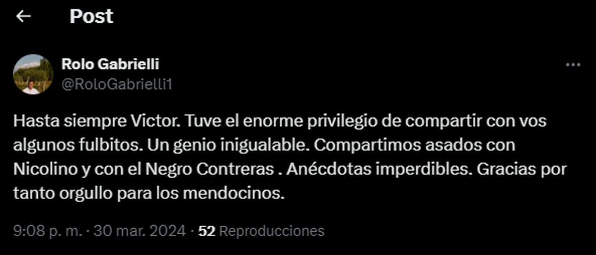 "Hasta siempre Victor. Tuve el enorme privilegio de compartir con vos algunos fulbitos. Un genio inigualable. Compartimos asados con Nicolino y con el Negro Contreras . Anécdotas imperdibles. Gracias por tanto orgullo para los mendocinos", escribió en este día tan triste.