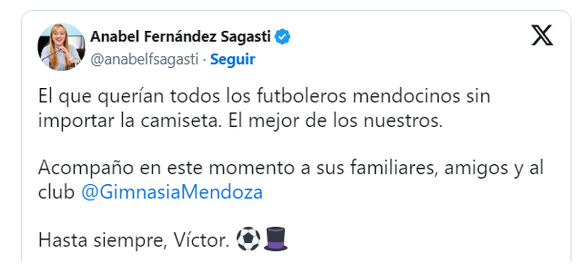 La referente del Frente de Todos redactó en su cuenta de X: "El que quería a los futboleros mendocinos sin importar la camiseta. El mejor de los nuestros. Acompaño en este momento a sus familiares, amigos y al club Gimnasia. Hasta siempre, Víctor".