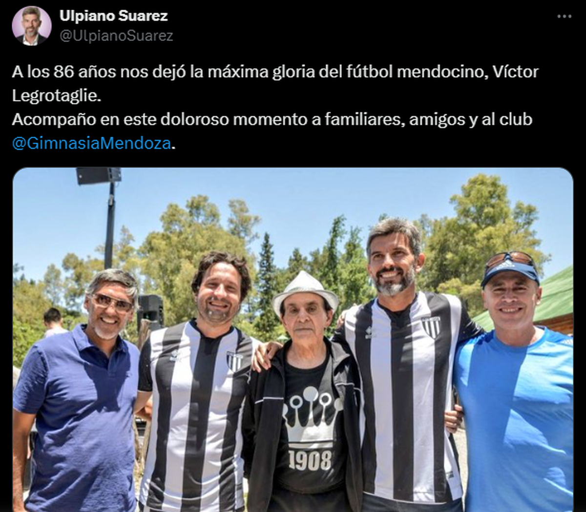 el intendente de Capital, Ulpiano Suarez lo recordó en las redes sociales: "A los 86 años nos dejó la máxima gloria del fútbol mendocino, Víctor Legrotaglie. Acompaño en este doloroso momento a familiares, amigos y al club".