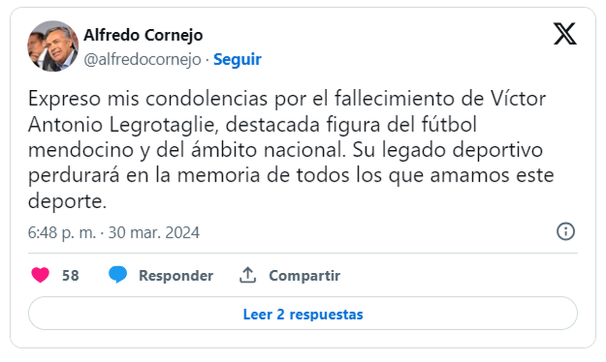 Entre los primeros en expresar su pesar se encontraba el gobernador Alfredo Cornejo, quien resaltó el legado dejado por Legrotaglie: "Expreso mis condolencias por el fallecimiento de Víctor Antonio Legrotaglie, destacada figura del fútbol mendocino y del ámbito nacional. Su legado deportivo perdurará en la memoria de todos los que amamos este deporte", afirmó el mandatario.