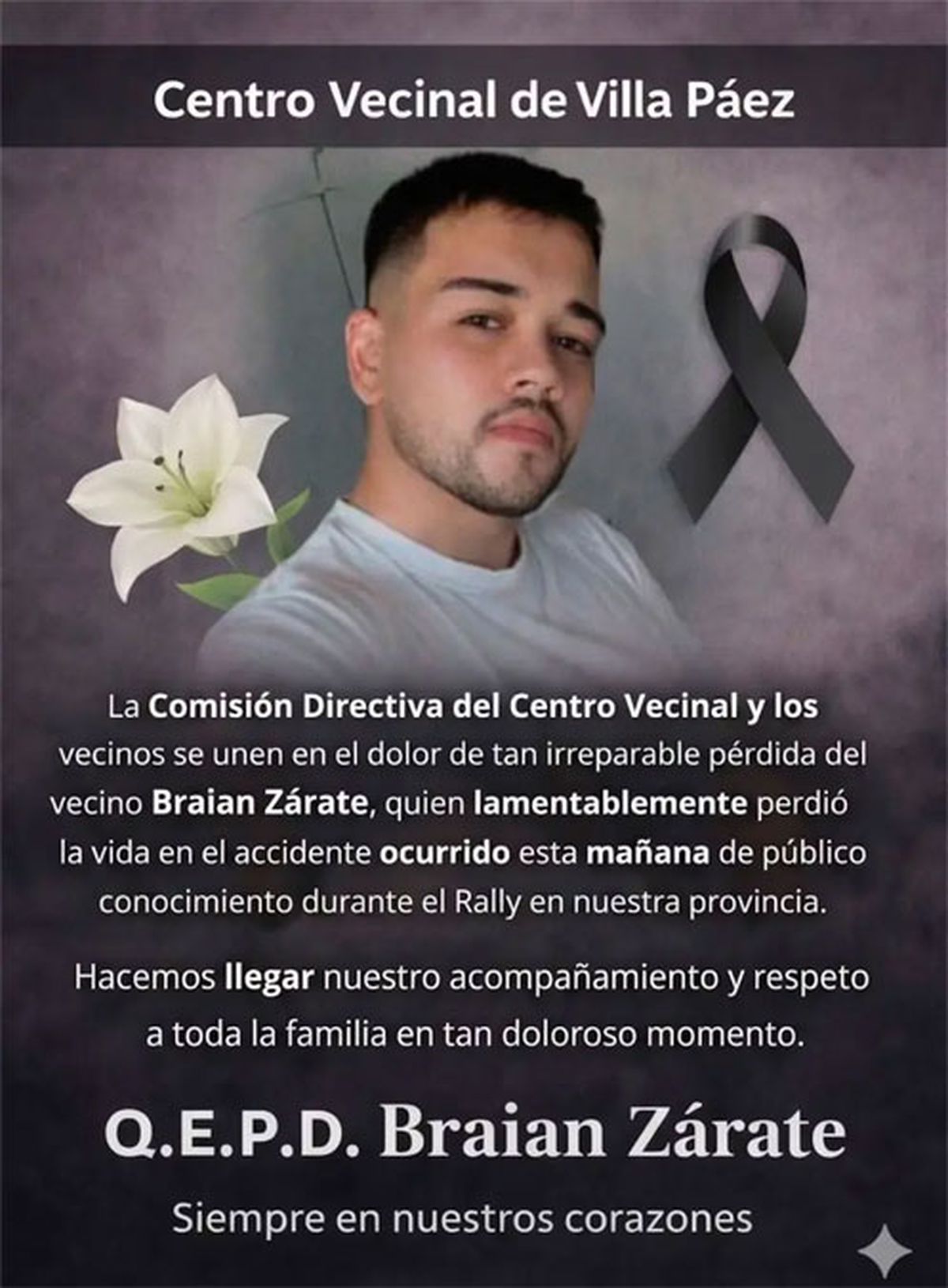 Desde el Centro Vecinal de Villa Páez, las autoridades barriales enviaron sus condolencias: “Día triste para nuestro barrio, fuerte abrazo a toda su familia. Nos unimos en el dolor de tan irreparable pérdida”.