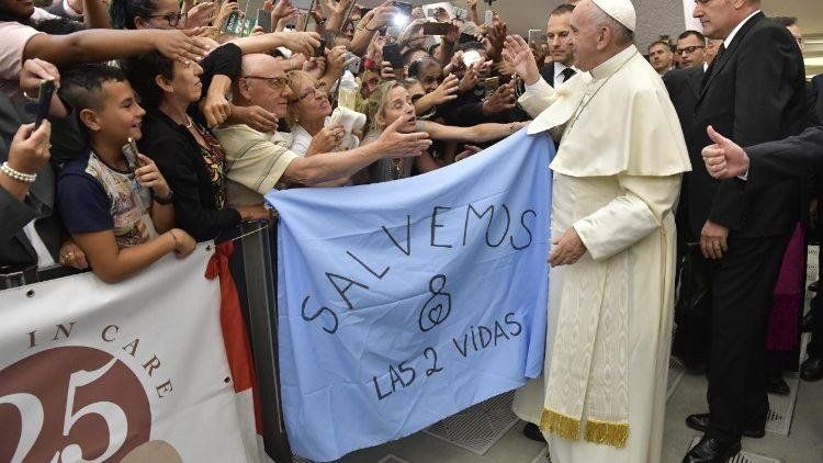 Un grupo de militantes argentinos en contra del proyecto del aborto legal desplegaron hoy una bandera celeste con la inscripción "Salvemos las 2 vidas" ante el Papa Francisco en una audiencia general en El Vaticano.