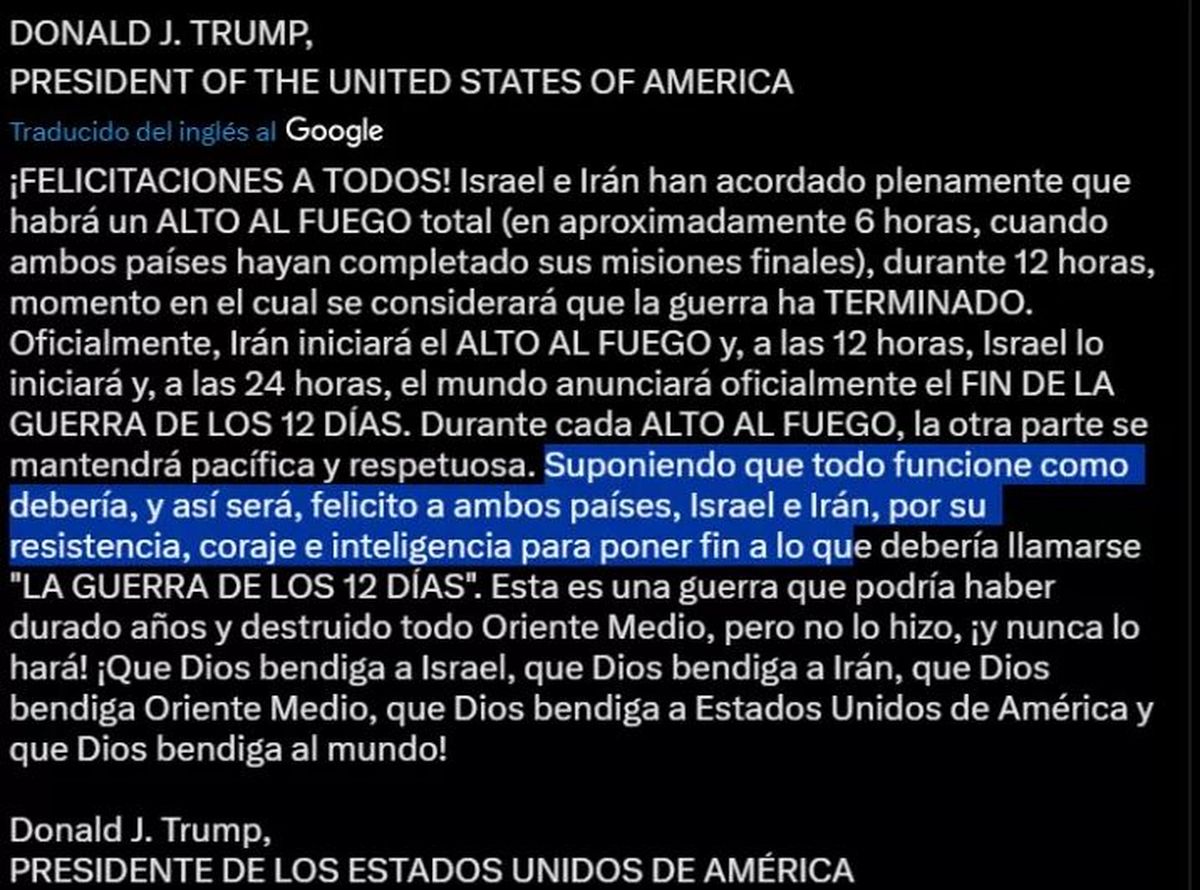 “Suponiendo que todo funcione como debería, que así será, quisiera felicitar a ambos países, Israel e Irán, por su resistencia, coraje e inteligencia para poner fin a lo que debería llamarse “la guerra de los 12 días". Esta es una guerra que podría haber durado años y destruido todo Oriente Medio, pero no lo hizo, ¡y nunca lo hará! ¡Que Dios bendiga a Israel, que Dios bendiga a Irán, que Dios bendiga Oriente Medio, que Dios bendiga a Estados Unidos de América y que Dios bendiga al mundo!”, concluye el mensaje del mandatario estadounidense.