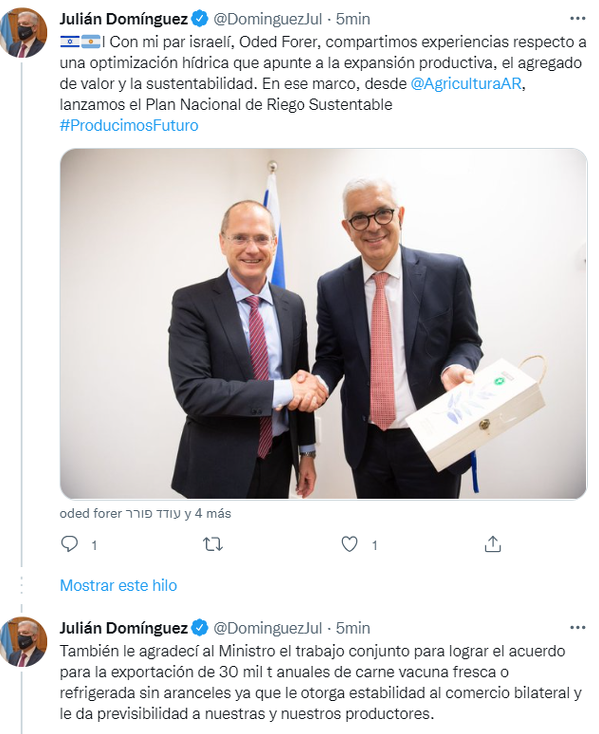 Domínguez destacó la importancia del acuerdo que le permitirá a nuestro país exportar libre de aranceles unas 30 mil toneladas anuales de la carne vacuna fresca o refrigerada a Israel y afirmó que se trata de "un mecanismo de estabilidad para el comercio bilateral que brindará previsibilidad a los productores y la industria en un mercado estratégico para nuestras exportaciones de carne".