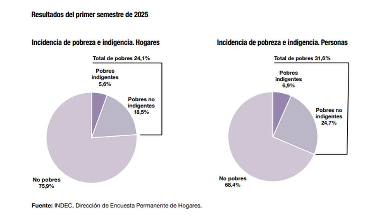 "Para el universo de 31 aglomerados urbanos de la EPH (Encuesta Permanente de Hogares), se encuentran bajo de la línea de pobreza 2.456.090 hogares, que incluyen a 9.451.018 personas. Dentro de ese conjunto, 565.821 hogares están por debajo de la línea de indigencia, lo que representa 2.051.984 personas indigentes", detalló el informe de INDEC.