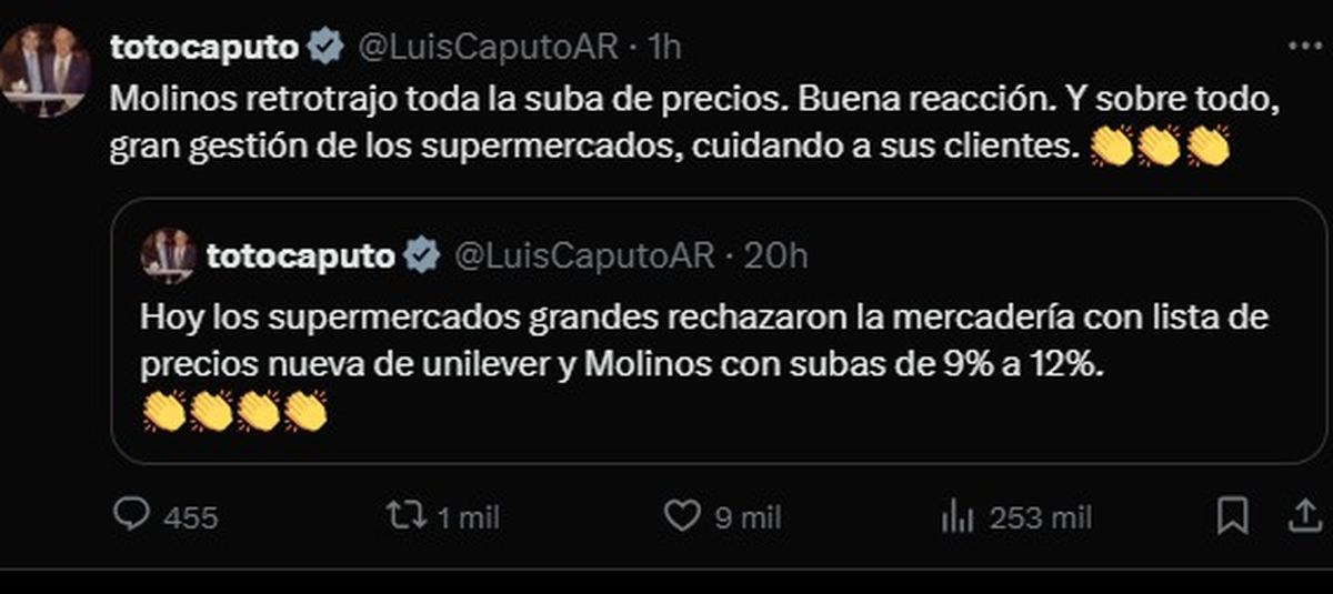 “Molinos retrotrajo toda la suba de precios. Buena reacción. Y sobre todo, gran gestión de los supermercados, cuidando a sus clientes”, publicó el ministro en la cuenta de “X”.