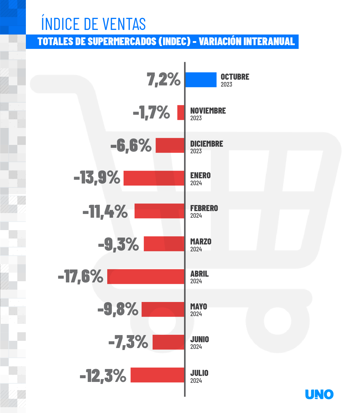 Las cadenas facturaron algo más de $1.588 millones en un mes. Pero el Índice de Ventas Totales a precios constantes que mide INDEC mostró una caída de 12,3% en julio contra igual mes de 2023. Ni siquiera el acumulado de los primeros 7 meses del año alcanza para mostrar algo distinto, ya que también dio negativo un 11,7%.