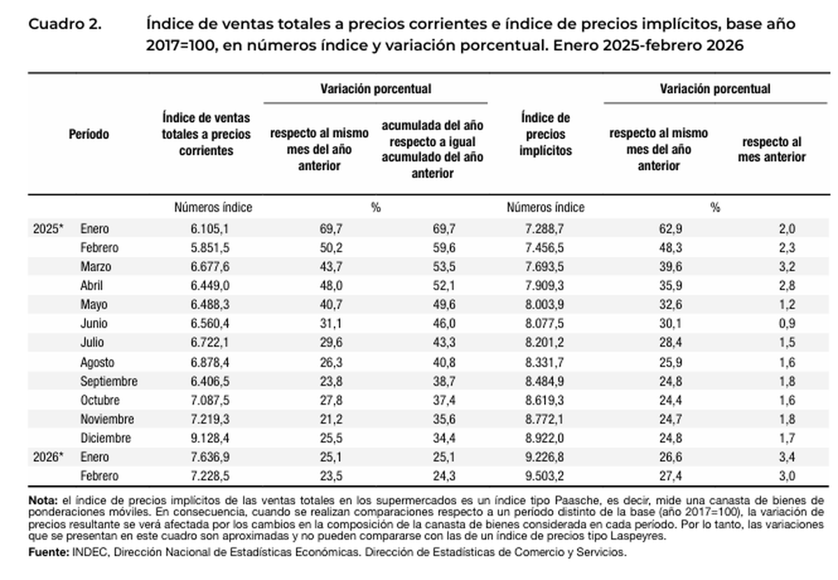 La caída del consumo se profundiza. Según el INDEC las ventas en supermercados se contrajeron 3,1% contra 2025, mientras que en autoservicios mayoristas la merma llegó a 1,2%, con un ticket promedio que pierde contra la inflación y cambios en los hábitos de compra y medios de pago por parte de los consumidores.
