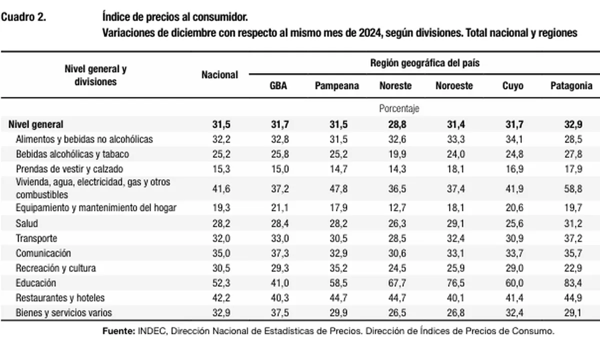 Entre divisiones, la estadística del 2025 expone al rubro Educación como el más inflacionario del año con el 52,3%. Pese a la merma del turismo receptivo, le siguió Restaurantes y hoteles (42,2%) y muy cerca el costo de Vivienda, servicios y combustibles, con 41,6%.