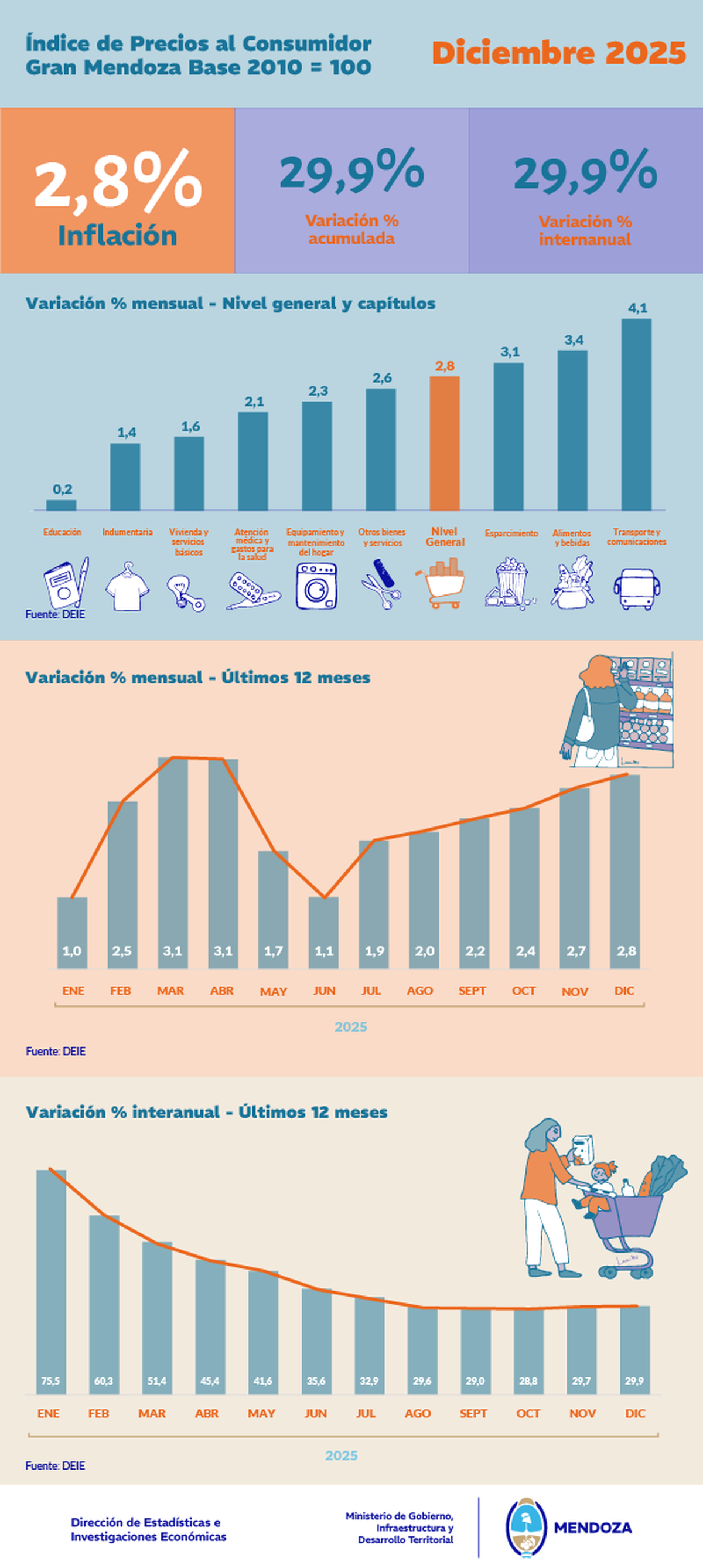 Con un 2,8% en diciembre, la inflación medida por el IPC (Índice de Precios al Consumidor) de la Dirección de Estadísticas de Mendoza quedó al nivel de la del país. Pero a lo largo del último año acumuló según la DEIE un 29,9%, lo que deja al llamado costo de vida en la provincia por debajo de la variación de precios nacional medida por el INDEC.