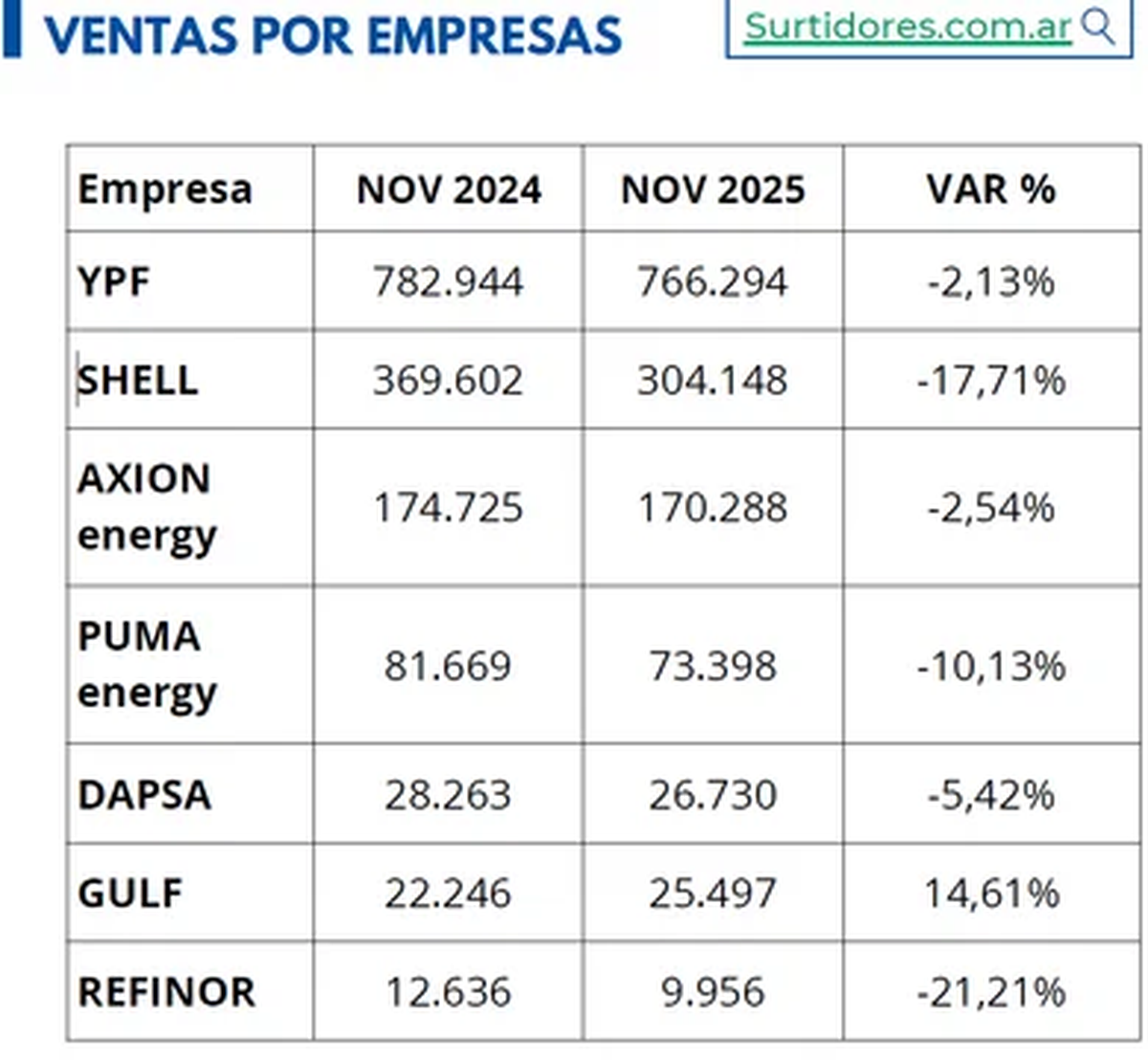 Con excepción de Gulf, que tuvo un crecimiento de 14,61%, todas las compañías sufrieron una caída en sus ventas respecto a noviembre del 2024.