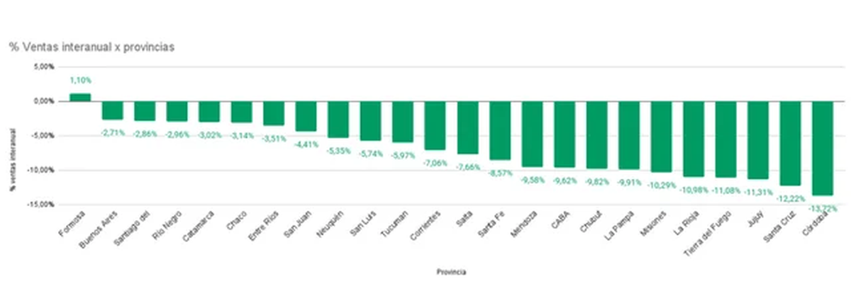 Al repasar el movimiento comercial en el país, surge que la caída de venta de combustibles registró picos del -11,31% en Jujuy, y de -12,2% y -13,7% entre Santa Cruz y Córdoba. En la otra punta, Buenos Aires, Formosa, Santiago del Estero y Río Negro registraron las menores mermas, del orden del 2%.