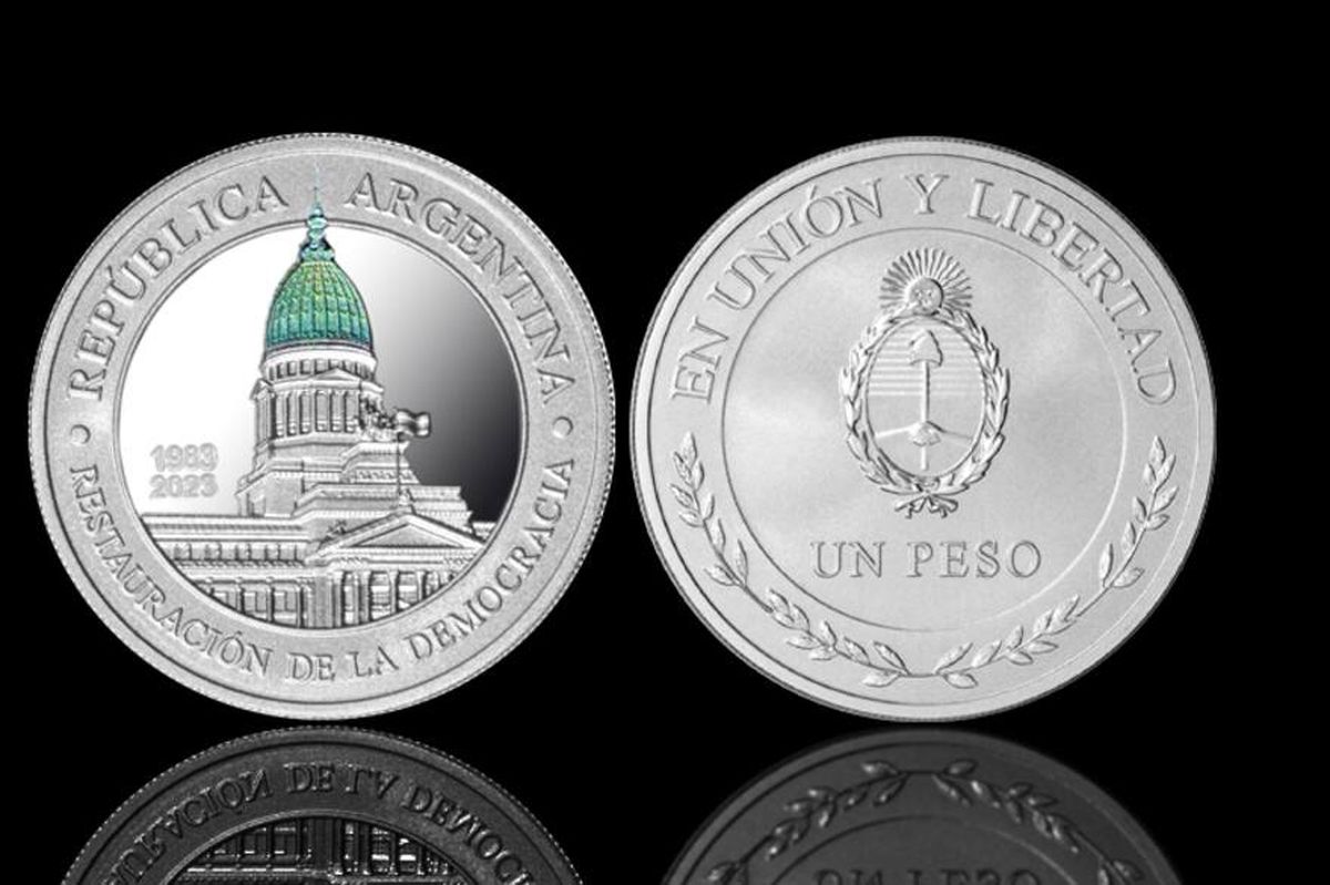 Según se explicó desde el Banco Central, la nueva moneda de 1 peso presenta, en el anverso, la imagen del Congreso de la Nación en donde se resalta el color verde de la cúpula. Junto al edificio se pueden leer los años 1983 y 2023. Mientras que en el arco superior tiene las leyendas "República Argentina" y "Restauración de la democracia" en el inferior.