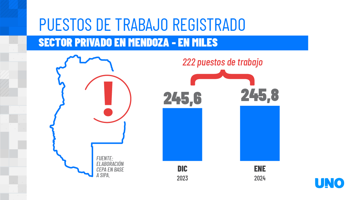 El Centro de Economía Política Argentina (CEPA) concluyó, en su último informe, que en enero de 2024 se generaron 222 puestos de trabajo en Mendoza, registrando un crecimiento del 0,1% con respecto a diciembre 2023.