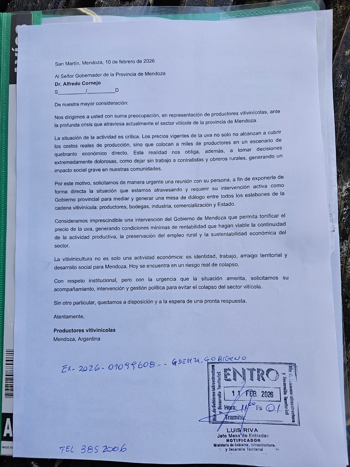 "Consideramos imprescindible una intervención del Gobierno de Mendoza que permita tonificar los precios de la uva, generando condiciones mínimas de rentabilidad que permitan la sustentabilidad económica y la continuidad del sector", dice el petitorio presentado durante la mañana del miércoles en el 4to piso de Casa de Gobierno en base a ese cuadro.