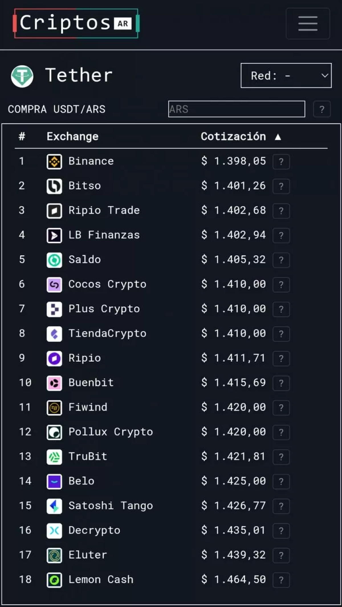 El dólar digital encaraba hacia el techo de la banda cambiaria establecida en el acuerdo con el FMI, en $ 1.470 por dólar. Las cotizaciones iban entre entre $ 1.398 y hasta $ 1.464 USDT, stablecoin equivalente a U$S 1 en pesos de acuerdo con las diversas exchanges de la plaza cripto en dólares.