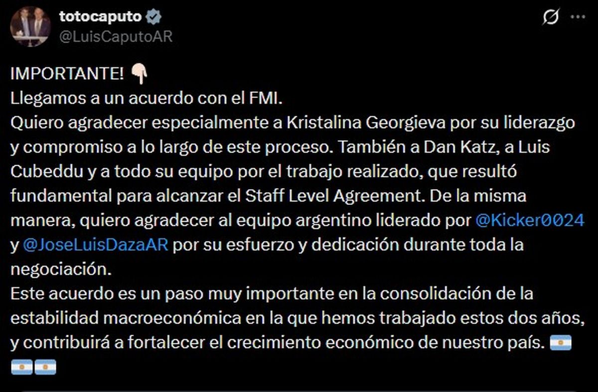Desde los Estados Unidos, el ministro Luis Caputo expresó su satisfacción por el avance: “Este acuerdo es un paso muy importante en la consolidación de la estabilidad macroeconómica en la que hemos trabajado estos dos años, y contribuirá a fortalecer el crecimiento económico de nuestro país”.